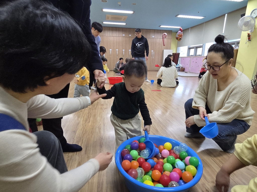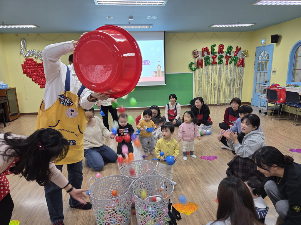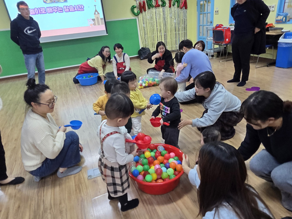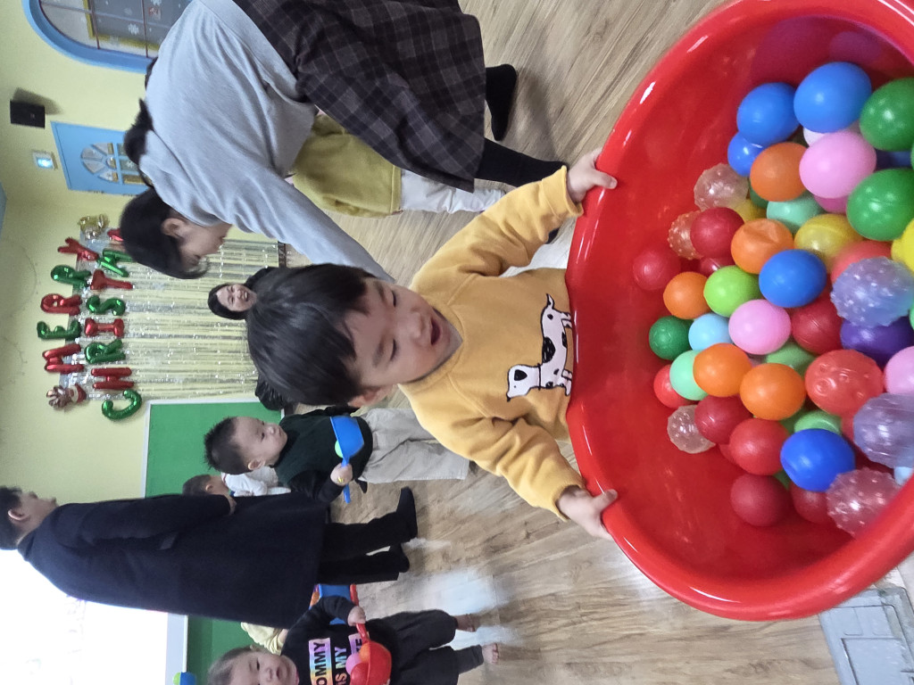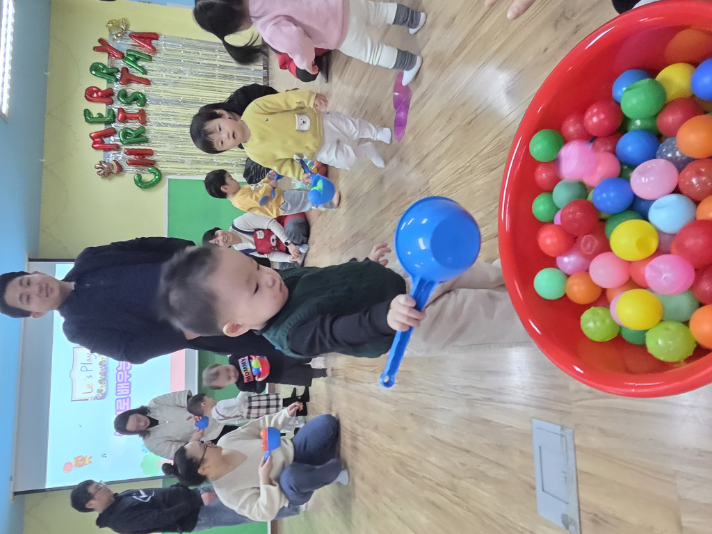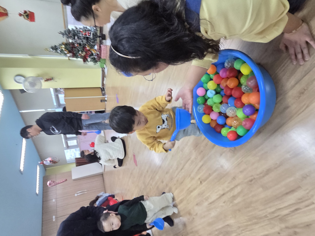 아이들이 좋아하는 볼풀공 놀이를 진행하며 바구니로 옮기는 놀이, 공을 갖고 놀며 아주 재미있는 놀이활동시간을 가졌습니다.