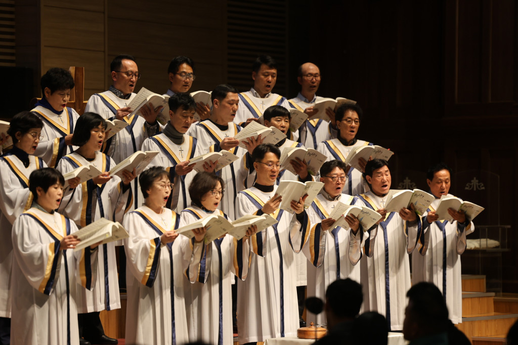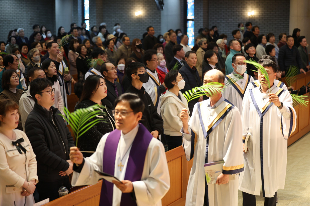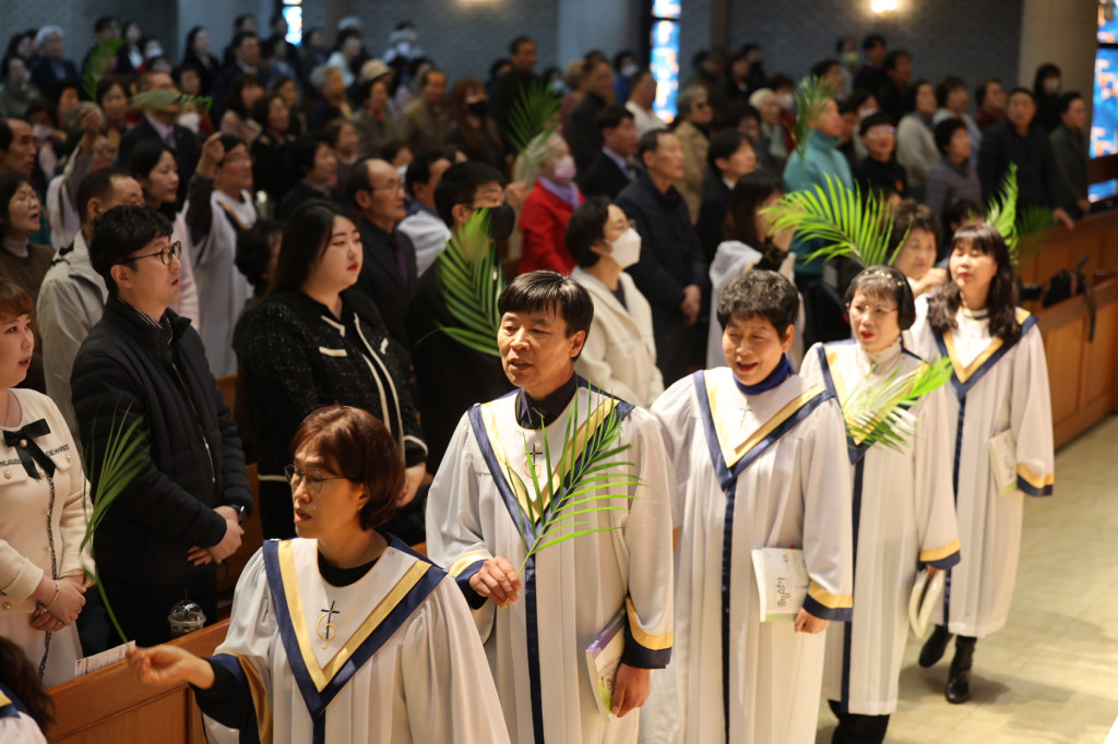 입례로 설교자를 비롯한 사회자와 찬양대가 종려나무 가지를 들고 흔들며