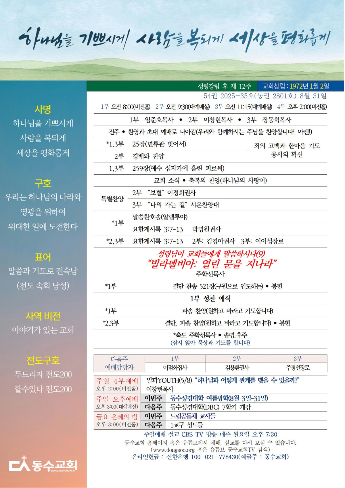 250831 동수교회 주일 예배 실황 영상 "성령님이 교회들에게 말씀하시다(9) 빌라델비아 : 열린 문을 지나가라"